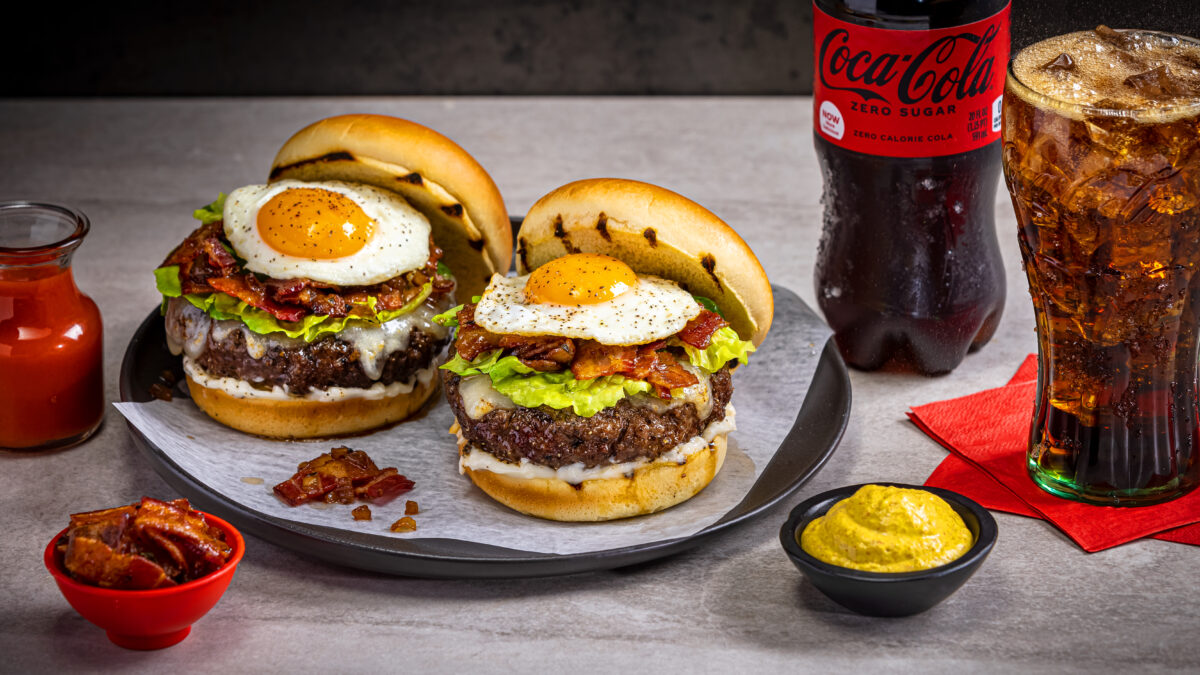 Spread bottom halves of buns with mayonnaise; serve burgers in buns topped with lettuce, bacon jam and eggs.